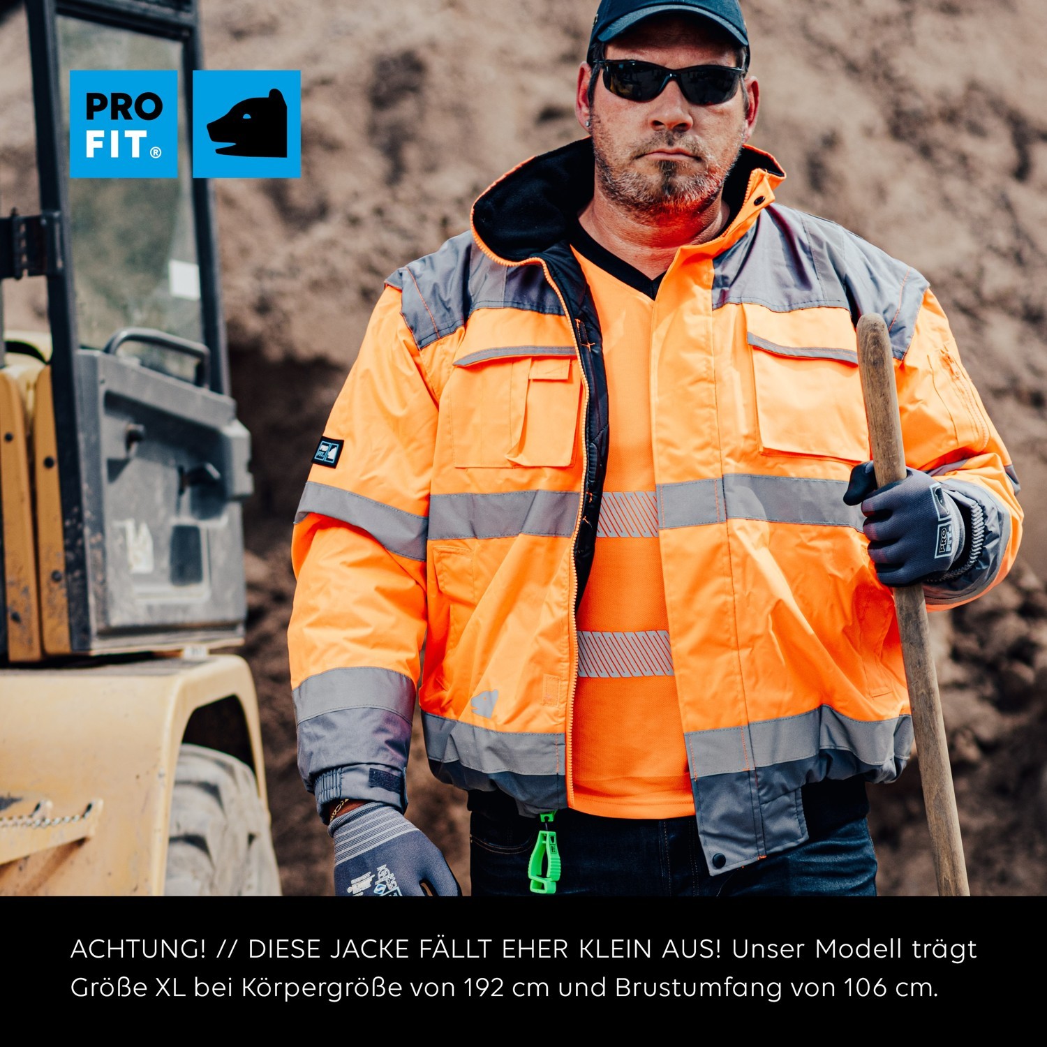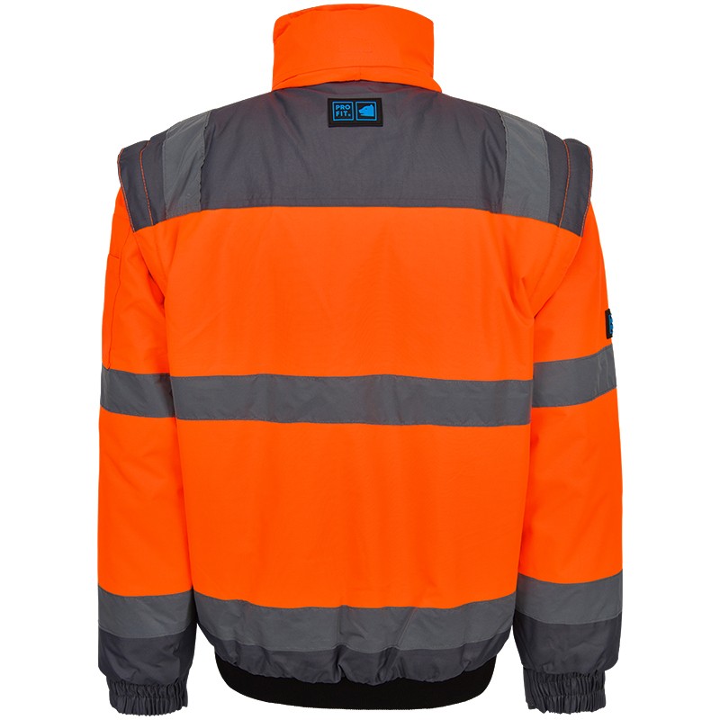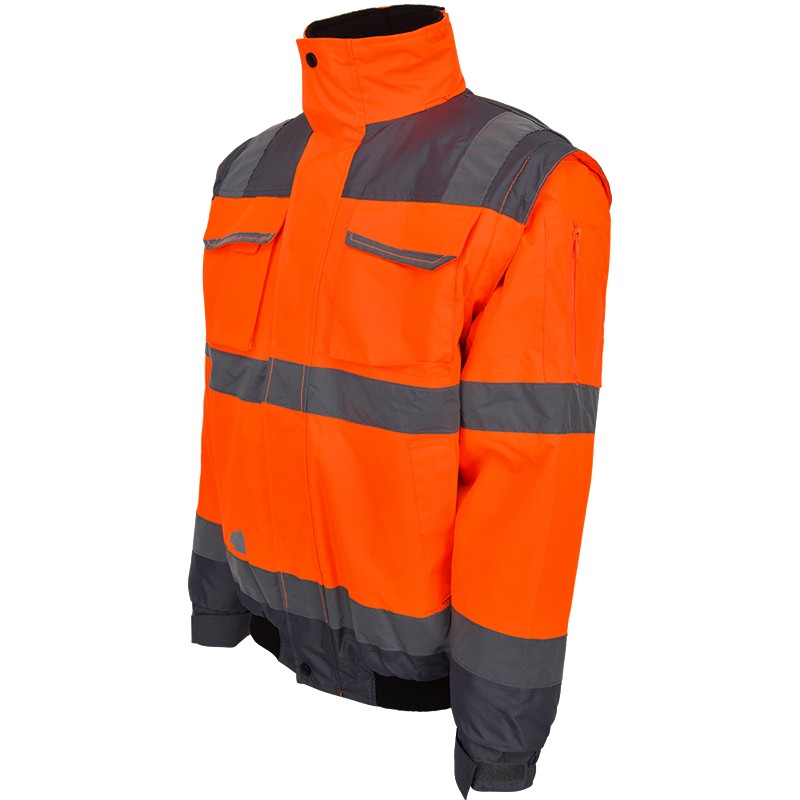 High-visibility pilot jacket, neon orange / grey, material is wind- and waterproof, removable sleeves, reflective stripes, with shoulder reflex, welded seams, hood integrated in the collar, fleece-lined collar, adjustable cuffs with integrated knitted waistband, knitted cuff at hem, front zip covered with flap, 1 sleeve pocket with zip, 2 breast pockets with flaps, right side with attached pen and mobile phone pocket, 2 side pockets, 1 inside pocket in lining