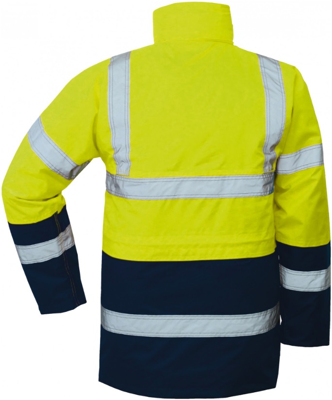 Standards: DIN EN ISO 20471:2013 Class 3 EN 343 Class 3Description wasserdicht taped seams water- and windproof collar with integrated hood water- and windproof sleeve cuffs removable quilted lining with effective cold protection Reflector stripes on shoulder/arm and torso adjustable drawcord in the waist area concealed 2 way/front zip with flap and press studs 2 large side pockets with flap 1 breast pocket/mobile phone pocket with flap and Velcro fastener 1 inside pocket with velcro fastener 1 side security pocket/napoleon pocket with zipper 1 hidden passport pocket in left side pocket watererdi: 3.000 mm Colour: bright yellow navy Sizes S- 5XLMaterial Upper: 100% 300D Oxford polyester with 180 g/m² PU coating Lining: 100% polyester Inner jacket: quilted lining with knitted cuffs 100% polyester 180g/m²