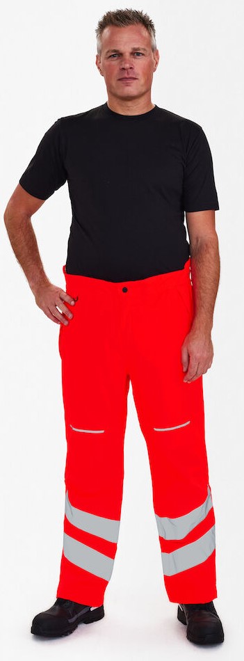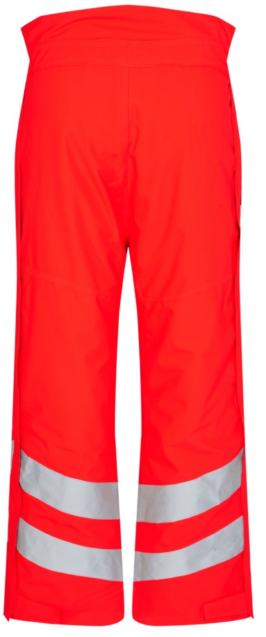 Fluorescent, breathable, waterproof and windproof winter trousers with taped seams. Two front pockets with Velcro fastener. D-ring at the front for attaching ID cards, for example. Extra high lumbar area and adjustable elasticated waist for maximum comfort. Concealed two-way zipper on the legs that allows access to the inner garment and snow guard/wind guard on the legs. Reinforced knees. Reflective stripes on the lower leg. Clothing class 3, tested after 50 washes.