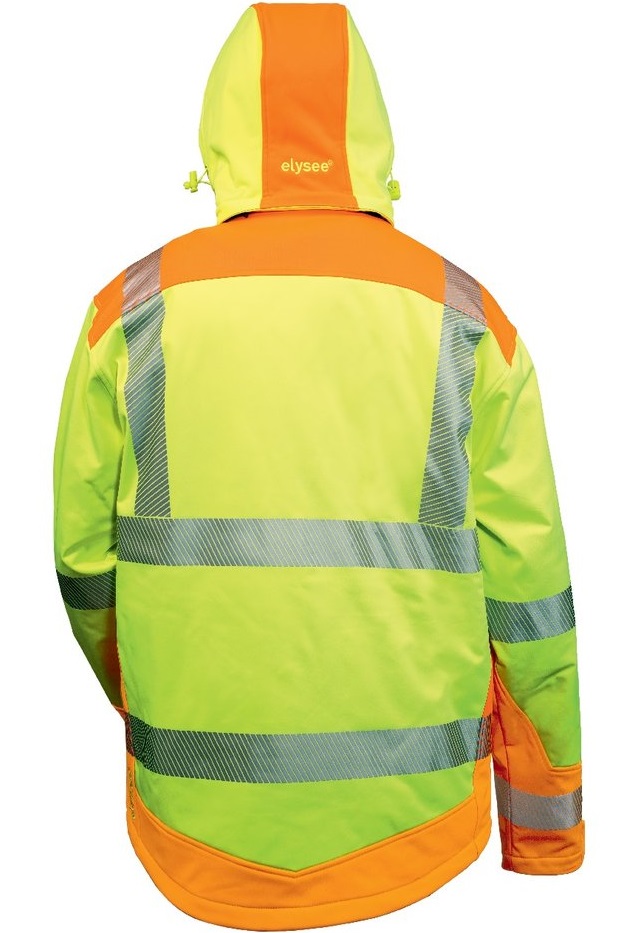 Standard EN ISO 20471 Class 3, EN ISO 13688 Upper 100% polyester, 3-layer laminate (Softshell) Breathability 1.000 g/m²/24h Water column 5.000 mm Lining 100% polyester Color fluorescent orange/ fluorescent yellow Sizes S-XXXL Softshell material is wind- and waterprooferdias well as breathable due to 3-layer laminate robust YKK® front zipper with flap highly abrasion-resistant, robust soft shell material thermofixed reflective strips, thus no additional seams Reflective stripes from 3M™ Scotchlite™ 5510 Reflective material removable, warming quilted lining with knitted cuffs at the cuffs Outer jacket with soft, comfortable fleece inside Reflective material front, back, shoulder and sleeves adjustable hem and sleeve hem detachable/adjustable hood easy emblem application due to removable lining Bags: 2 pockets above the hem 1 breast pocket 1 inside pockets in lining PU: 5
