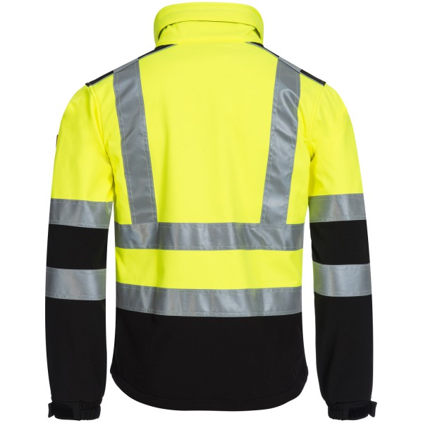 NITRAS MOTION TEX VIZ, high-visibility softshell jacket, neon yellow / black, 310 gsm, comfortable to wear thanks to soft softshell material with water- and wind-repellent properties and extended back, Velcro and elasticated cuffs and drawcord hem for optimum fit and support, sporty design, stand-up collar, 3M Scotchlite™ Reflective material for better visibility, full-length YKK zipper with chin guard and double-layer wind stopper inside, inside, chest and side pockets, regular fit, detachable hood available as an option.