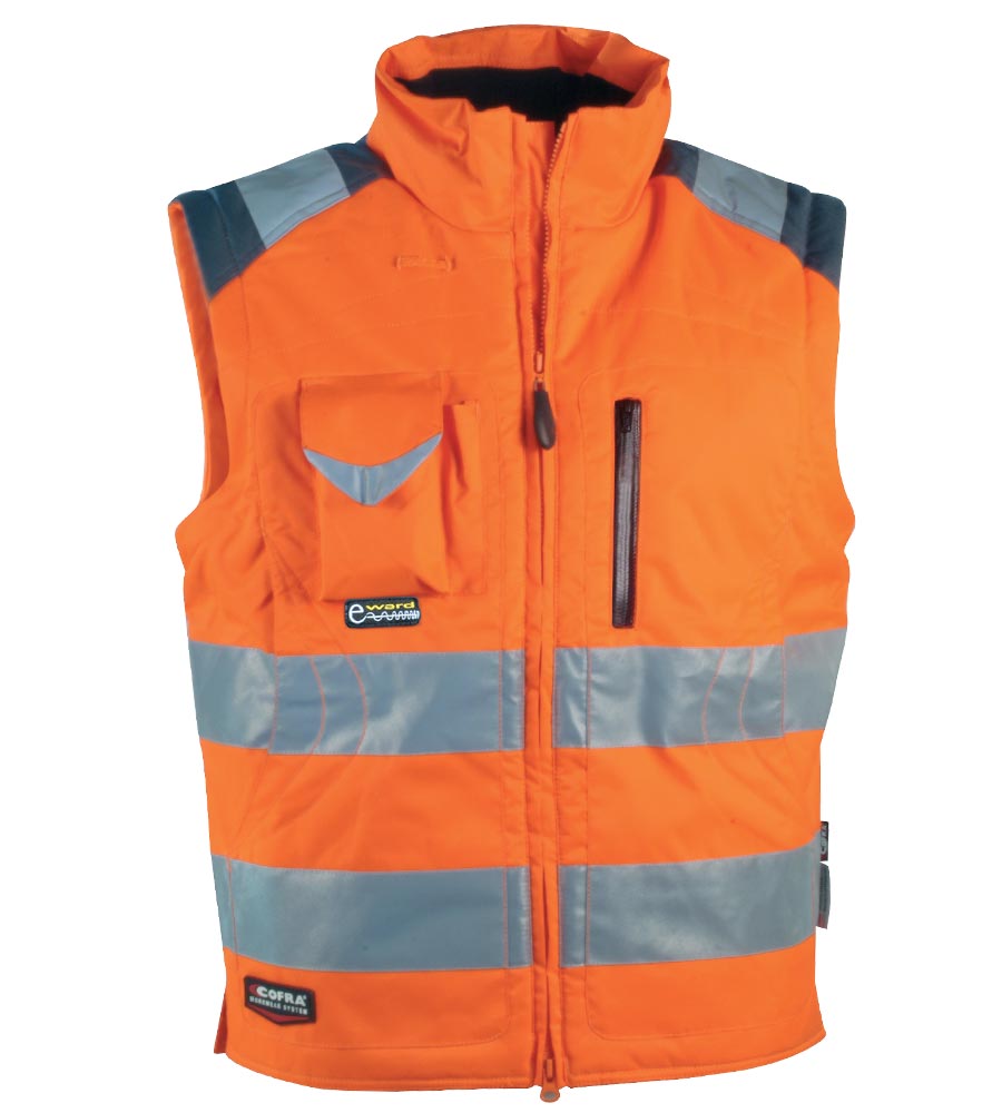 Wide front pockets, chest pocket with coated zipper, cell phone pocket in fabric E-WARD, lining with top in fleece, inside pocket with zipper, cable pocket for handsfree, detachable sleeves in fleece with zipper, side vents, pen pocket, stripes and reflective inserts, extended back, adjustable hood in collar