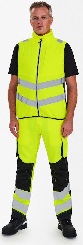 Warm, fluorescent vest in a modern design with wind and water-repellent properties. The vest can be combined with the 1146-930 models, which have a zipper for zipping in. Reflective zipper at the front. Two side pockets and chest pocket with zipper. The vest has an elasticated cuff at the bottom and armhole. Reflective stripes across the shoulders and around the waist. Clothing class 1, tested after 50 washes.