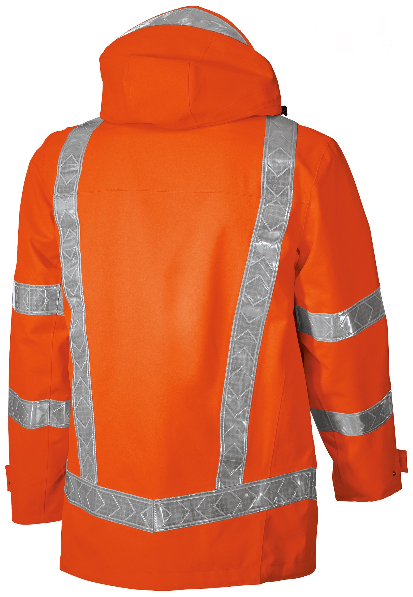 Made for you: reflective stripes for 360° visibility, detachable hood, can be combined with warming fleece jacket BP 1872 and BP 2025, regular fit Product description: Standards: EN ISO 20471 high visibility class 3, EN 343 weather protection waterproof class 3, EN 14058 (1.3.X) protection in cool environments. outer fabric 1: 100% polyester lining: 100% polyester fabric weight: 205 g/m² OEKO-TEX STANDARD 100 Stand-up collar, detachable hood with double width adjustment, waterproof front zipper with double snap fastener, taped seams, 2 side pockets closable with snap fastener, 1 Napoleon pocket with zipper, 2 breast pockets closable with Velcro, ergonomically shaped sleeves, arm lift system for more freedom of movement, adjustable sleeve cuffs, 1 inside pocket, large repair opening, inside hem width adjustment 2 reflective stripes on each sleeve, 1 circumferential reflective stripe above the hem, 2 circumferential vertical reflective stripes on each front and back, can be combined w