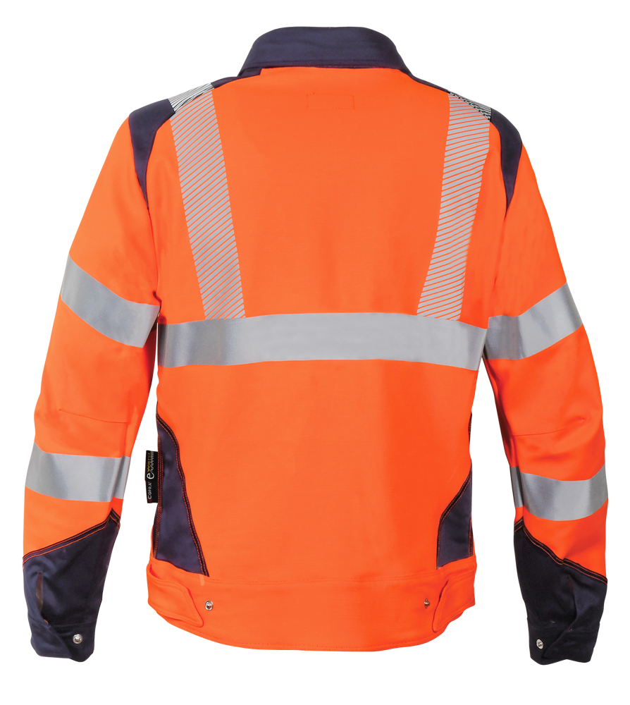 1 horizontal reflective stripe, 2 wide bottom pockets with zippers, 2 vertical segmented reflective stripes, badger ring, chest pocket made of E-WARD fabric with zipper, adjustable cuffs and waist width with snap closure.