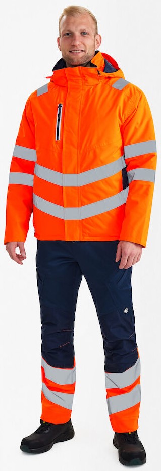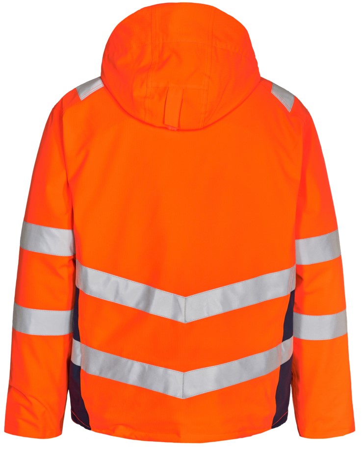Breathable, waterproof and windproof winter jacket with taped seams and a modern design. The jacket has a high collar and is cut longer at the back. Double button placket with zipper and Velcro fastening at the front. Spacious side pockets, chest pocket and inside pocket, all with zippers. Detachable, adjustable hood with sufficient space for a work helmet. Adjustable storm flap at the bottom to keep out wind and weather. Ribbed cuffs and collar protect against draughts. Zipper in the lining suitable for printing/embroidery. Reflective stripes across the shoulders and around the sleeves and waist. Clothing class 3, tested after 50 washes.