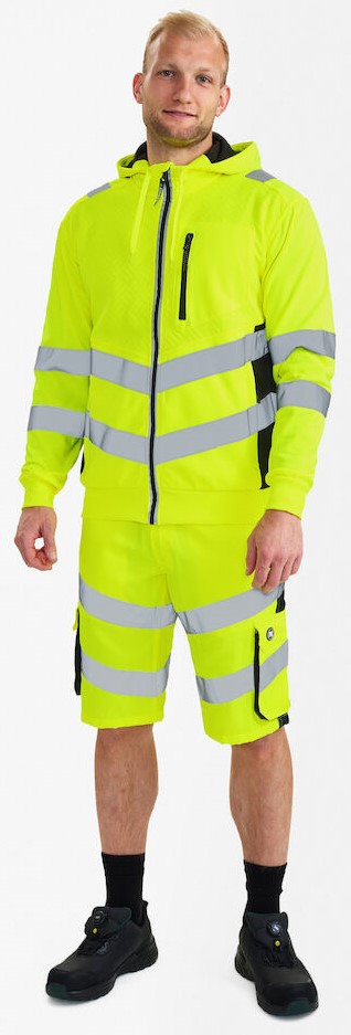 Functional, fluorescent sweat cardigan in a modern, attractive design with stretch lining. Lightly brushed inside, making the fabric soft and comfortable. Reflective zipper at the front. Two spacious side pockets and a chest pocket, each with a zipper. The sweat cardigan has a waffle texture on the front and hood. Ribbed knit at the bottom of the sleeves and hem. Stretchy reflective stripes across the shoulders and around the sleeves and waist. Clothing class 2, tested after 25 washes.