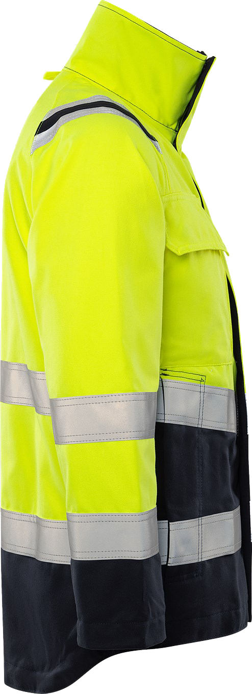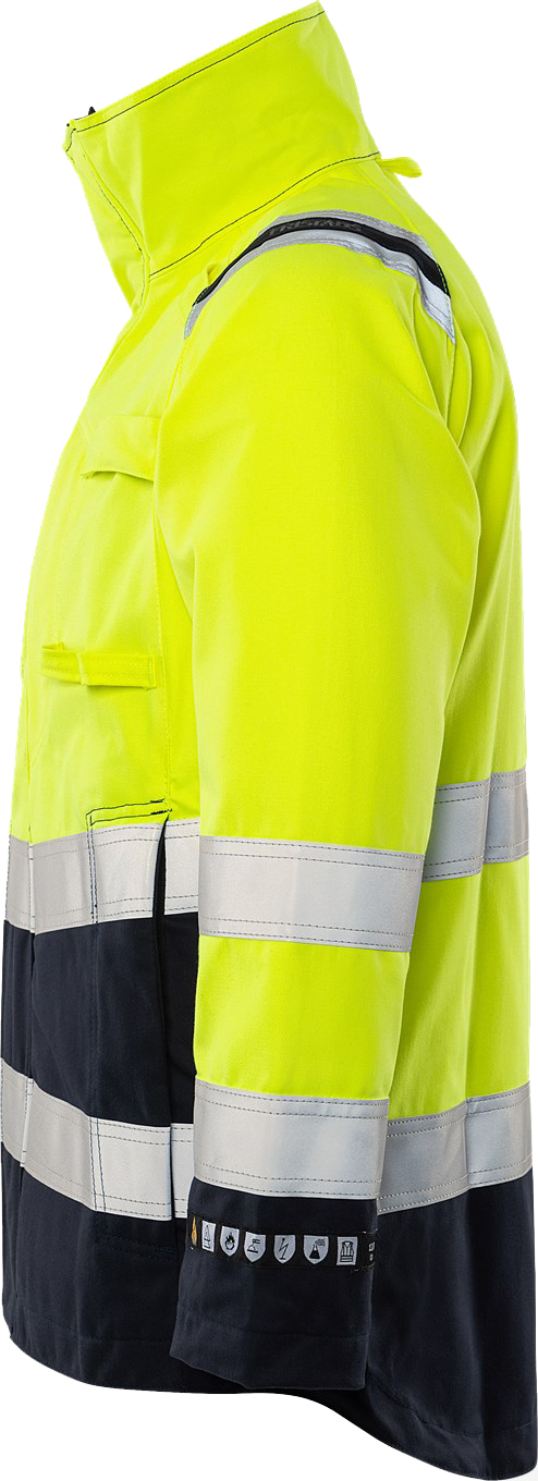 High-visibility certified jacket with inherent flame protection, suitable for ATEX environments, without metal parts. Suitable for industrial laundering.