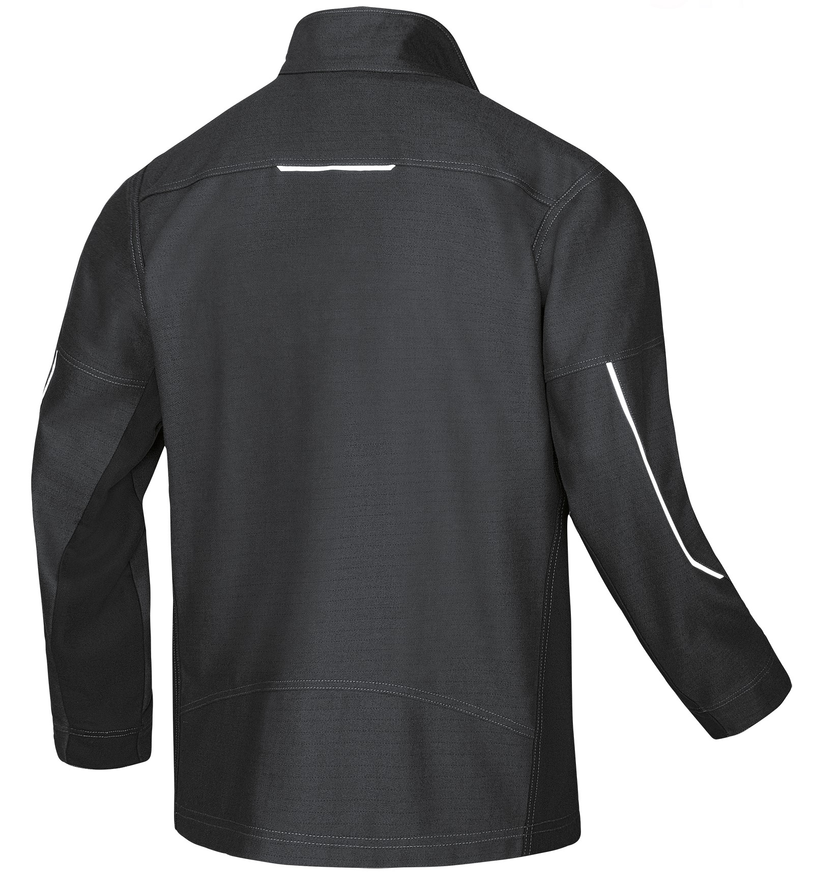ergonomically shaped sleeves, arm lift system for more mobility, inside knitted cuffs for comfortable protection, reflective piping on sleeves and back center