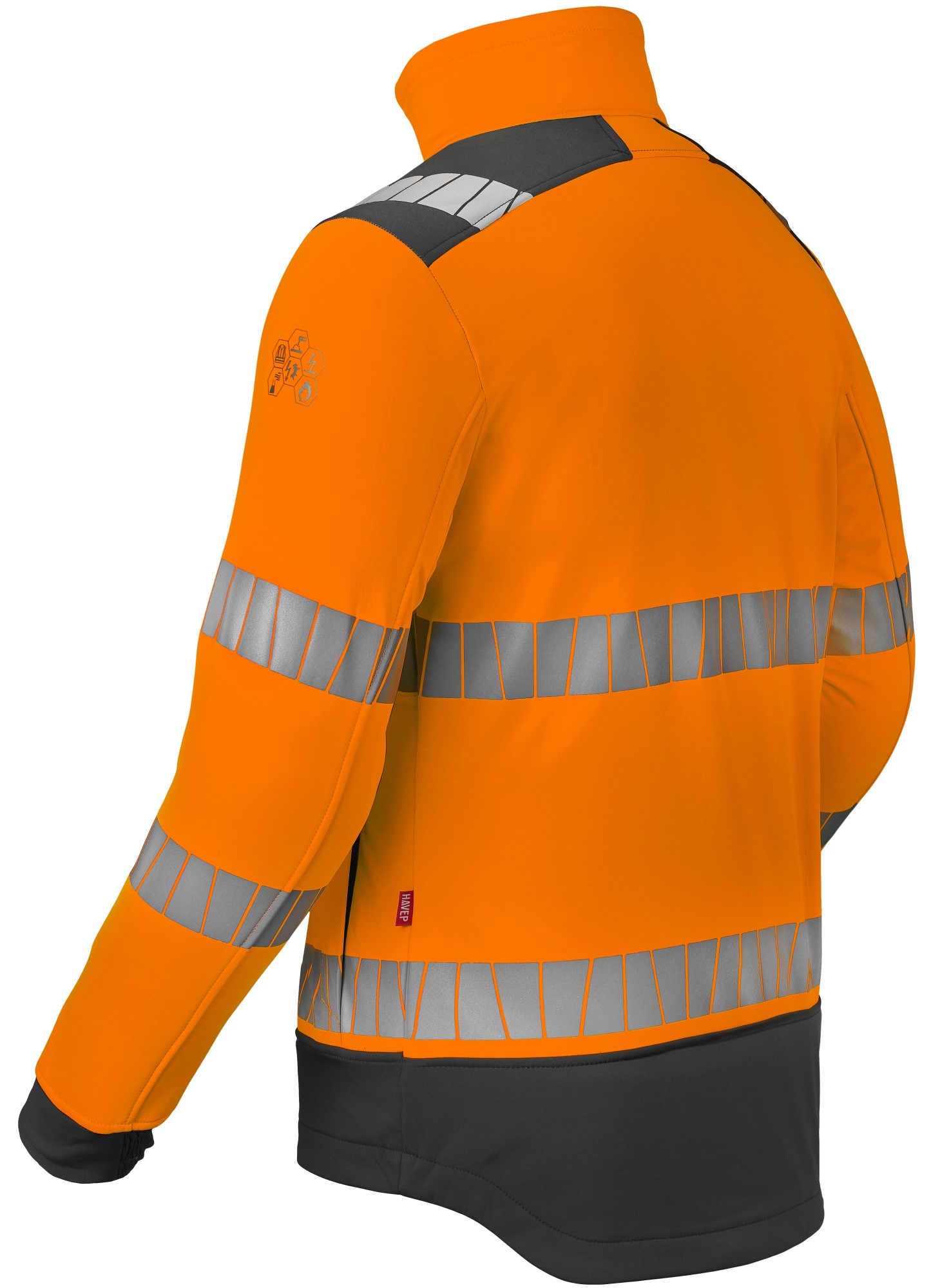 Softshell from the HAVEP® Multiprotector+ collection. This jacket meets 6 standards and is made from recycled polyester. Standards: EN ISO 20471 Class 3 EN ISO 11612 A1, B1, C1, F1 EN ISO 11611 A1 Class 1 EN 1149-5 IEC 61482-2 APC1 EN 13034 Type PB(6) Properties: Material: 98%/2%; 100%; 60%/40% | polyester (recycled)/carbon, PU membrane, modacrylic/cotton | 3-laminate | 350 g/m² concealed zipper with concealed Velcro fastener 2 inset side pockets with concealed zipper, 1 with D-ring 1 breast pocket with flap and snap fastener inner pocket with zipper Breathable, windproof and water-repellent 2 gas mask loops sleeves with jersey storm flap Chin guard Reflective tape Extended back Colors: warning orange/charcoal (CAK), warning yellow/charcoal (CBK) Sizes: XS- 5XL