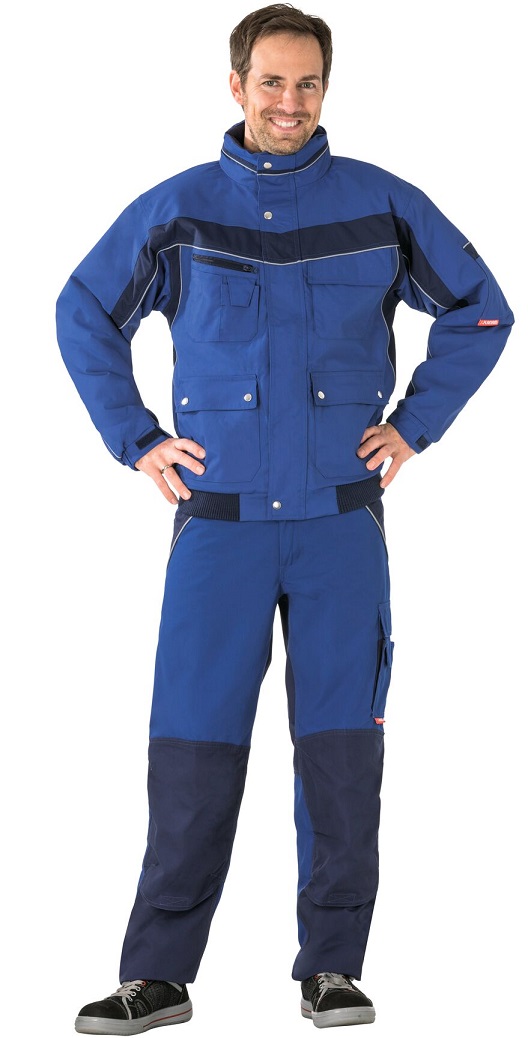 Breathable, waterprooferdi, glued seams, fleece collar, reflective piping as safety feature, hood in collar, 1 breast pocket left with flap and Velcro fastener, double breast pocket right, mobile phone pocket on right breast, 2 pen pockets, 2 side pockets, 2 patch side pockets, sleeve pocket on the left, document pocket under the front flap, quilted lining, concealed front zip, knitted cuffs on hem, elastic sleeve cuffs adjustable with Velcro.