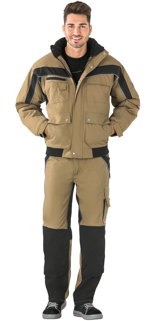 Breathable, waterprooferdi, glued seams, fleece collar, reflective piping as safety feature, hood in collar, 1 breast pocket left with flap and Velcro fastener, double breast pocket right, mobile phone pocket on right breast, 2 pen pockets, 2 side pockets, 2 patch side pockets, sleeve pocket on the left, document pocket under the front flap, quilted lining, concealed front zip, knitted cuffs on hem, elastic sleeve cuffs adjustable with Velcro.