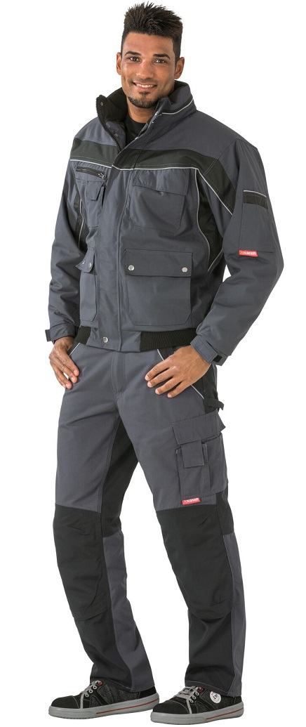 Breathable, waterprooferdi, glued seams, fleece collar, reflective piping as safety feature, hood in collar, 1 breast pocket left with flap and Velcro fastener, double breast pocket right, mobile phone pocket on right breast, 2 pen pockets, 2 side pockets, 2 patch side pockets, sleeve pocket on the left, document pocket under the front flap, quilted lining, concealed front zip, knitted cuffs on hem, elastic sleeve cuffs adjustable with Velcro.