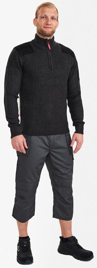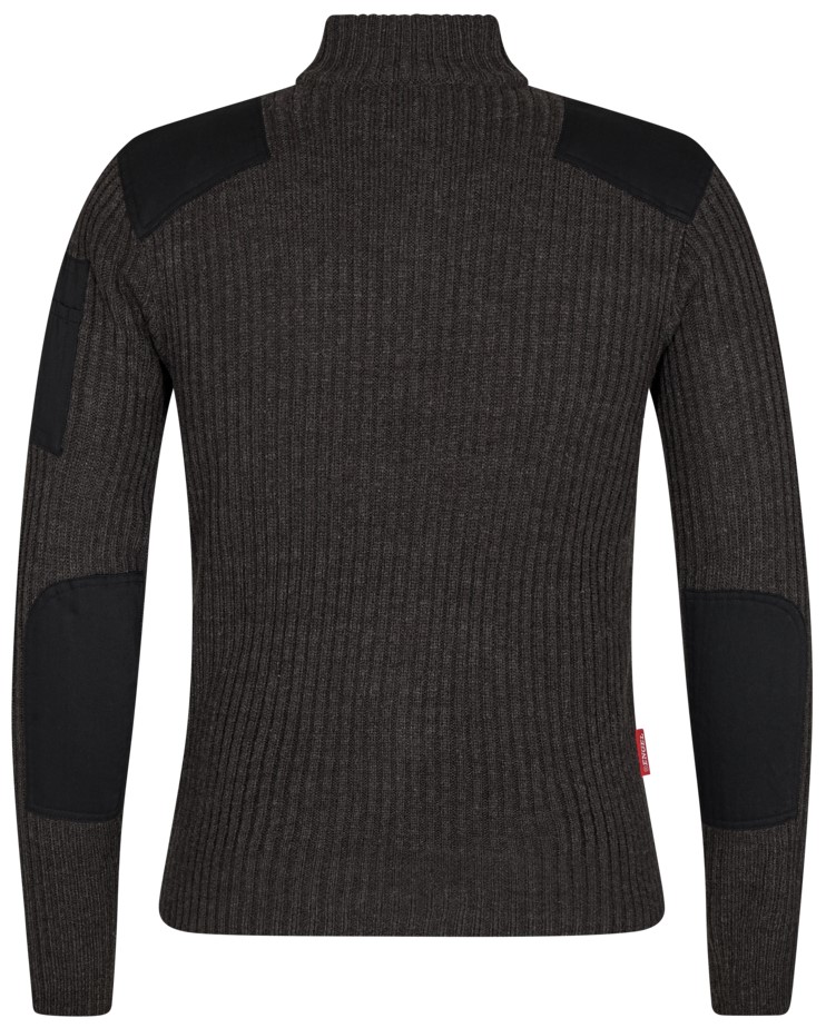 Comfortable rib-knit sweater with a high collar and zipper. Shoulders and elbows are reinforced with canvas. Pocket with slot for pens, for example, on the left sleeve.