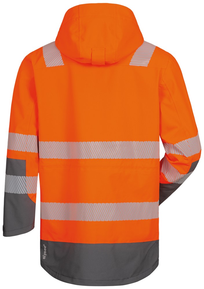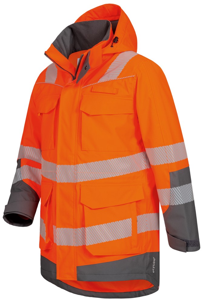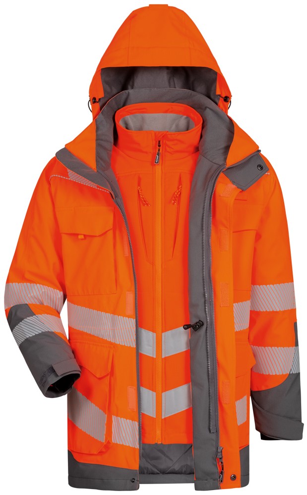 Standards: EN ISO 20471 class 3 EN 343 class (4.4.X) EN ISO 13688 Other features: Upper: 100% polyester, ripstop Lining: 100% polyester Breathability:10.000 g/m²/24 h Water column: 10.000 mm ripstop outer material is wind and waterproof, abrasion and tear resistant and has a slight mechanical stretch thermofixed reflective stripes, therefore no additional seams concealed 2-way YKK® front zipper order no. 22432 and 22433 can be zipped in as warming inner jackets modern ergonomic fit very comfortable on the skin elastic mesh lining detachable storm hood with preformed peak adjustable waist heavily used areas are set off in contrasting color loop in the right chest for attaching ID cards or radio equipment detachable ID-card holder included colors: orange/grey Sizes: XS-4XL