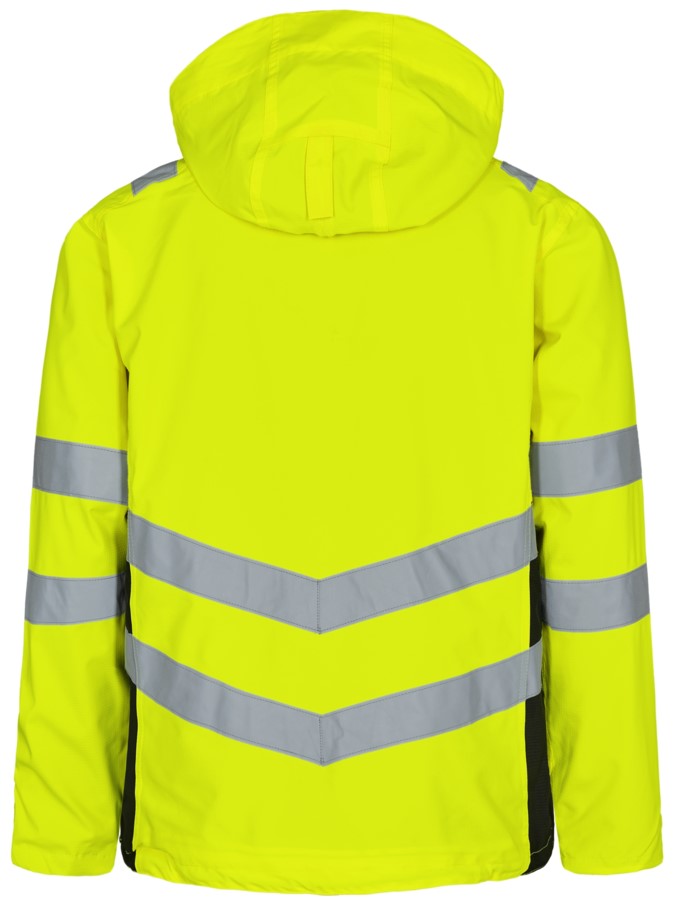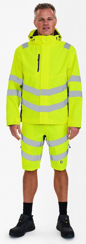 Fluorescent, breathable, waterproof and windproof shell jacket with taped seams and high collar in a modern design. Double button placket with zipper and Velcro fastener at the front. The jacket can be combined with the 1192-236, 1159-158 and 5159-158 models, all of which have a zipper for zipping in. Two spacious side pockets and chest pocket with zipper as well as large inside pockets with Velcro fastener. Detachable, adjustable hood with sufficient space for a work helmet. Adjustable cuffs. Zipper in the lining, suitable for printing/embroidery. Reflective stripes across the shoulders and around the sleeves and body. Clothing class 3, tested after 50 washes.