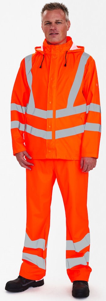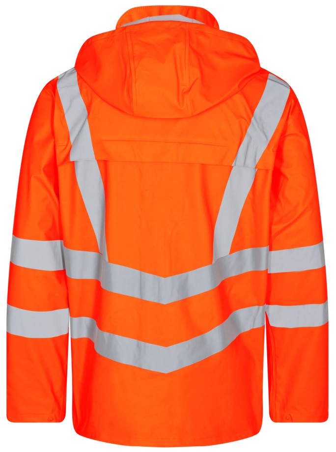 Functional rain jacket with taped seams and ventilation at the back. Zipper and Velcro fastener at the front. Two spacious and functional side pockets and large inside pockets. Detachable, adjustable hood with space for a work helmet. Possibility to adjust the sleeves. Clothing class 3, tested after 5 washes