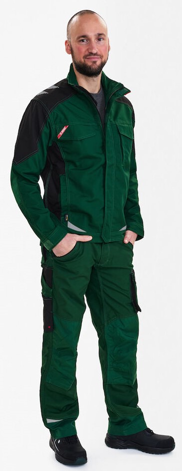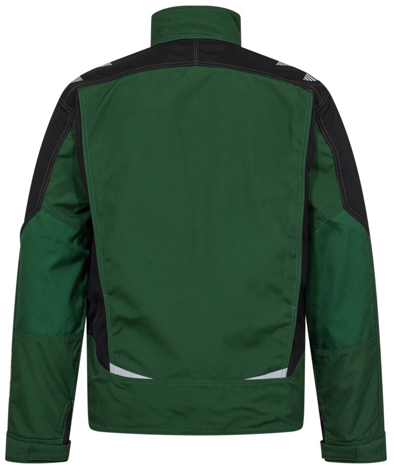 Functional work jacket with many details. Extended back section with movement pleat. Concealed zipper at the front. Reinforced elbows. Two spacious slit pockets. Two breast pockets with flaps - the right one with a loop and D-ring for attaching an ID card, the left one with an additional zipped pocket for a cell phone. Two large inside pockets with Velcro fastener. Adjustable cuffs. Reflective stripes on the shoulders, front and back for increased visibility. Suitable for industrial laundering.