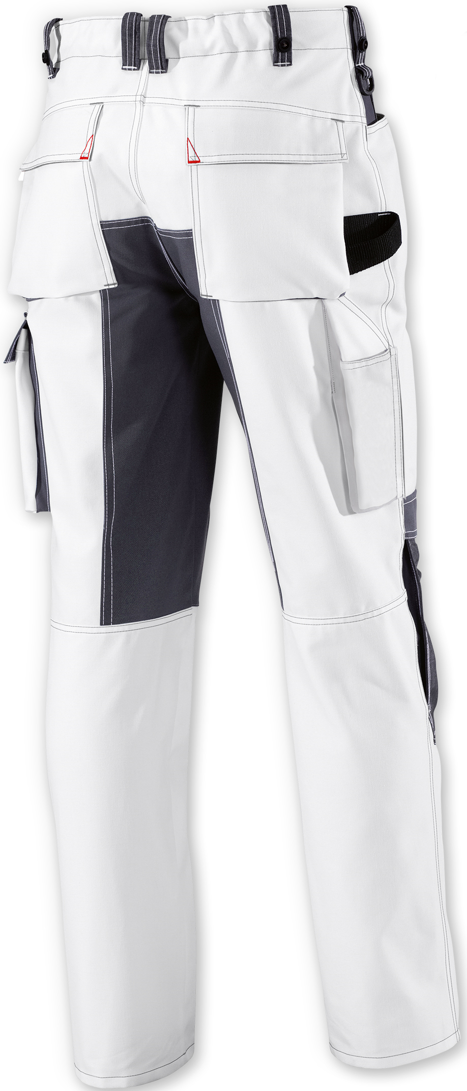 Double waistband button and back elastic waistband for optimal fit, ergonomic cut, D-ring, 2 side pockets, 2 back pockets closable with flap and printer