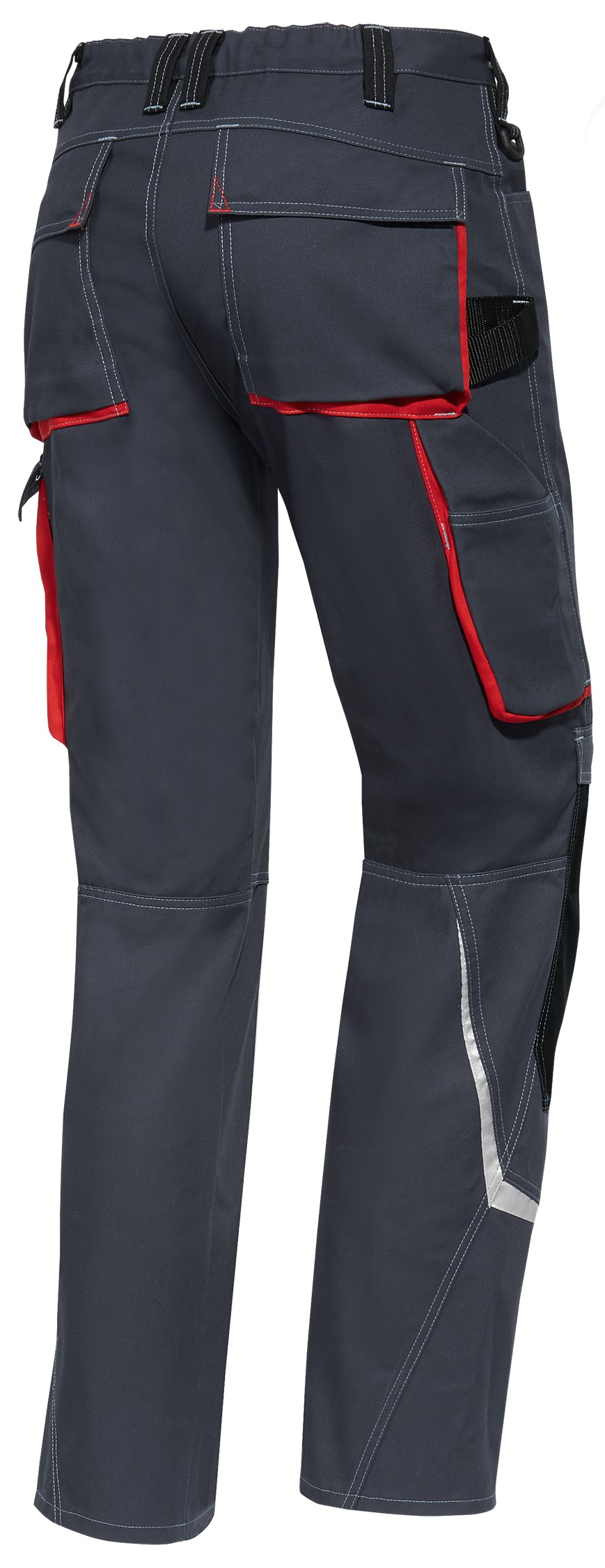 - double waistband button and back stretch waistband for optimal fit, ergonomic cut, D-ring, 2 side pockets, 2 back pockets closable with flap and printer, hammer loop