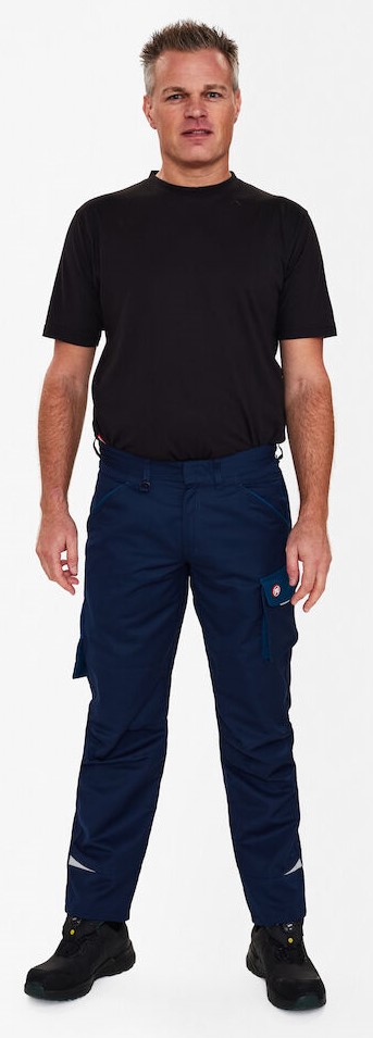 Functional work trousers with many details. Optimum fit, including ergonomically shaped knees and a panel on the inseam in the crotch for greater comfort. Two spacious, slanted slit pockets at the front. Loop with D-ring (front) for attaching an ID card. Two spacious back pockets, the right one with flap and Velcro fastener. Thigh pocket with zipper pocket for cell phone, additional small pocket. Folding rule pocket with additional compartments. The ruler pocket has a free-hanging bottom. Reflective strips at the bottom of the trouser legs for increased visibility. Suitable for industrial laundering.