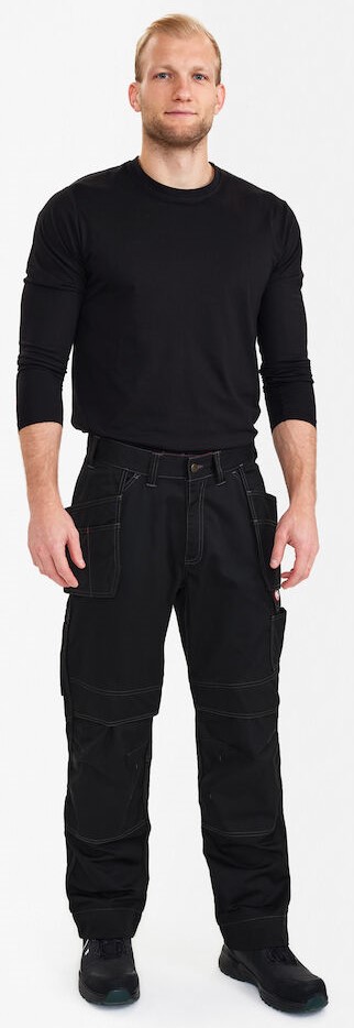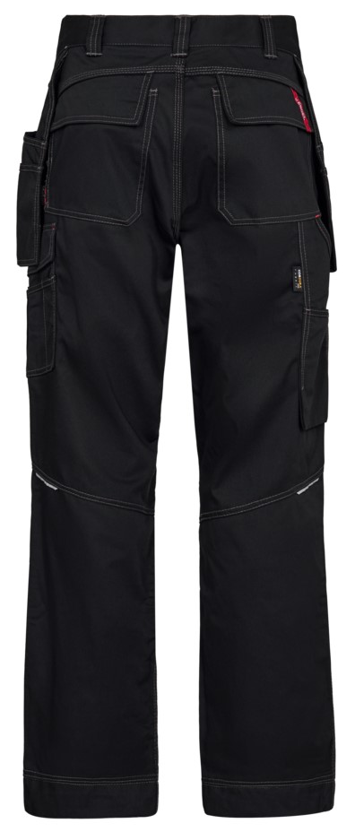 Functional craftsman trousers with contrasting topstitching. Optimum fit, ergonomically shaped knees. Two spacious, slanted slit pockets and two holster pockets at the front. Two back pockets with flap. Thigh pocket with flap and inserts for pens, for example. Free-hanging, reinforced folding rule pocket with extra compartments guarantees optimum freedom of movement. Adjustable hammer loop. Reinforced knee pockets with two adjustment options for knee pads. Reinforced hem on trouser legs for extra wear resistance. High visibility thanks to reflective piping in the middle of the back of the trouser legs. The pants have an extra wide turn-up so that the crotch length can be extended if required. For additional leg length, only one hem needs to be unzipped, behind which there is an additional hem.