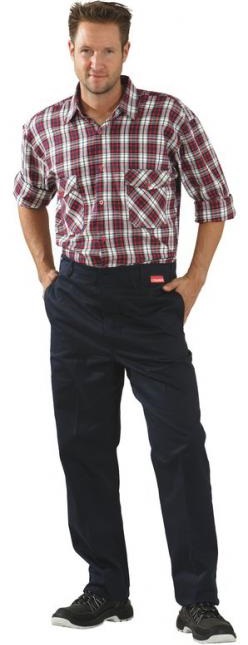 round waistband with 7 loops, fly buttoned, 2 set-in front pockets, 1 reinforced back pocket, 1 ruler pocket.