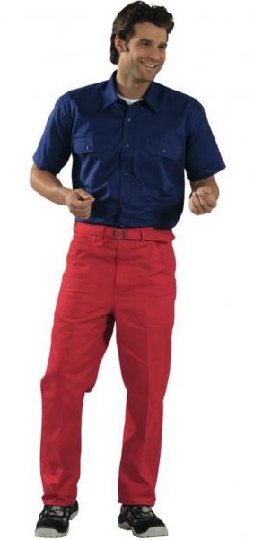 cotton for best wearing comfort! Round waistband with 7 loops, belt with metal buckle, fly with zipper, 2 patch front pockets, reinforced, 1 back pocket, 1 ruler pocket.
