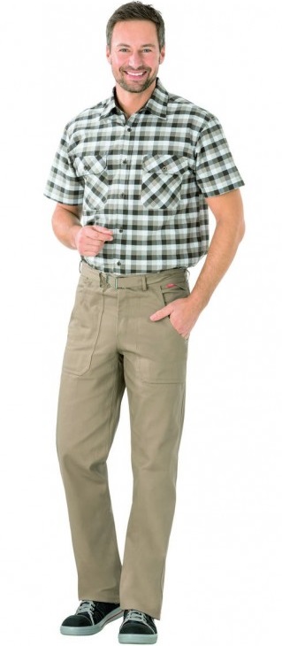 cotton for best wearing comfort! Round waistband with 7 loops, belt with metal buckle, fly with zipper, 2 patch front pockets, reinforced, 1 back pocket, 1 ruler pocket.