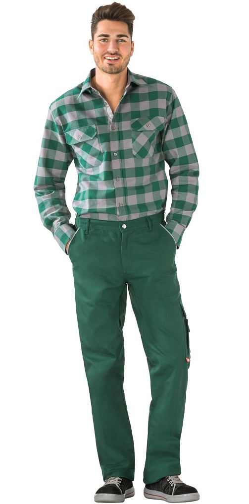 2 set-in pouch pockets, right double ruler pocket, reflective piping at the pocket openings and the pocket flaps, left thigh pocket with flap and press studs, attached mobile phone pocket, elasticated waistband, right 1 reinforced hip pocket, round waistband with 7 belt loops and jeans button, zipper in trouser fly.