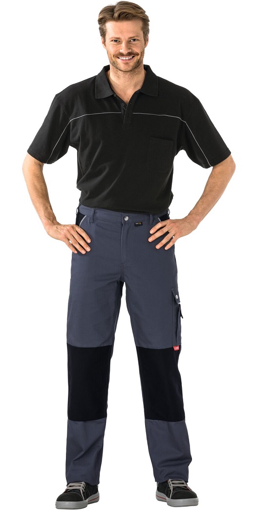 This article, in conjunction with a knee PLANAMpad (Art. No. 9901027), is certified as knee protection according to EN 14404 Type 2, Level 1. Knee pockets made of Cordura®, 2 set-in pouch pockets made of Cordura®, double ruler pocket made of Cordura® on the right, reflective piping on the pocket openings and pocket flaps, thigh pocket on the left with flap and press studs, mobile phone pocket on top, elasticated waistband, 1 reinforced back pocket on the right, round waistband with 7 belt loops and jeans button, zip in trouser fly.