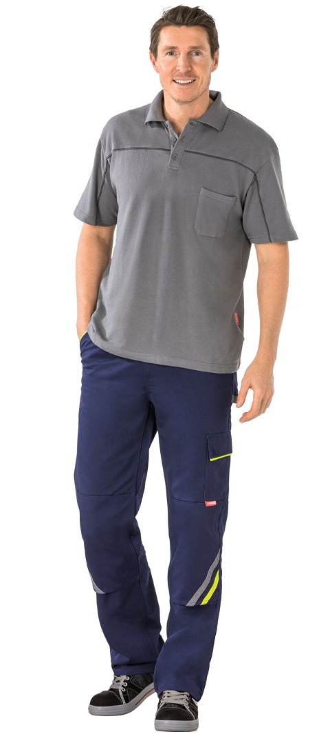 This article, in combination with a knee PLANAMpad (art. no. 9901027), is certified as knee protection according to EN 14404 type 2, level 1. 2 set-in pouch pockets, 2 patch knee pockets with coloured applications, double ruler pocket, left thigh pocket with flap and Velcro fastener, mobile phone pocket, elasticated waistband, 2 hip pockets with flaps, zip in fly, pocket openings and pocket flaps with coloured piping.