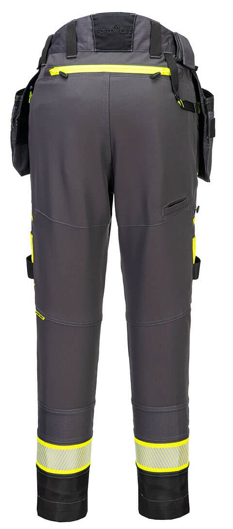 The DX4 ladies' waistband trousers with detachable high-vis holster are ergonomically designed and use the targeted placement of dynamic 4X stretch fabrics to ensure maximum freedom of movement when working. The trousers have a raised back waistband with elasticated sides to ensure protection in all working positions. Triple stitched seams for maximum durability.