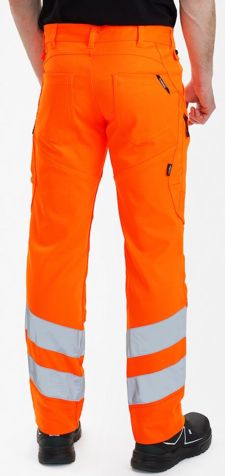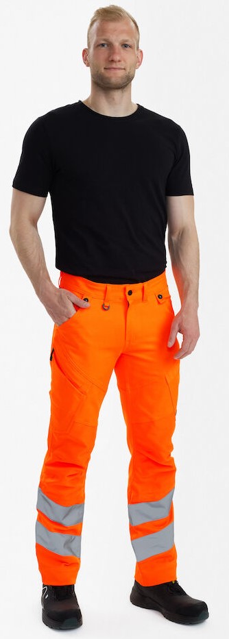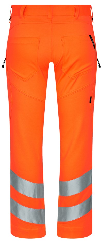 Stretchy, functional and fluorescent trousers in a modern design. Optimum fit with ergonomically shaped knee area. The stretchy fabric ensures optimum freedom of movement and comfort. D-ring at the front for attaching ID cards, for example. Two spacious slanted front pockets. Two back pockets. Two thigh pockets with zippers. The left thigh pocket has an additional cell phone pocket. The right thigh pocket has an attached reinforced ruler pocket with additional dividers. Knee reinforcement/knee pocket with Velcro fastener at the bottom and made of CORDURA® material. Reflective stripes on the lower leg. Wide bottom hem that can be left out if extra leg length is required. Only one seam needs to be undone to lengthen the trousers. The trouser leg is still hemmed. Clothing class 2, tested after 50 washes.