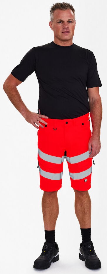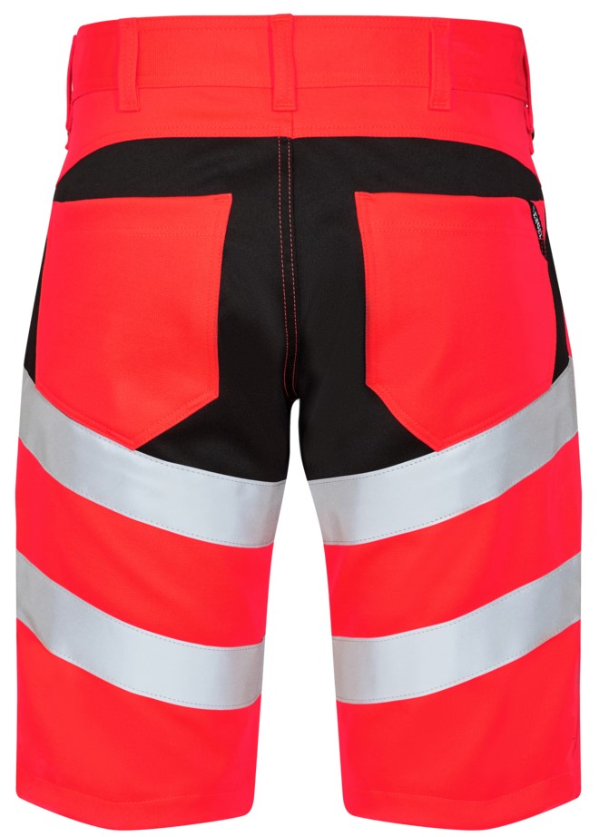 Stretchy, functional and fluorescent shorts in a modern design. Optimum fit. The stretchy fabric ensures optimum freedom of movement and comfort. D-ring at the front for attaching ID cards, for example. Two spacious slanted front pockets. Two back pockets. Two thigh pockets with zippers. The left thigh pocket has an additional cell phone pocket. The right thigh pocket has an attached reinforced ruler pocket with additional dividers. Clothing class 1, tested after 50 washes.