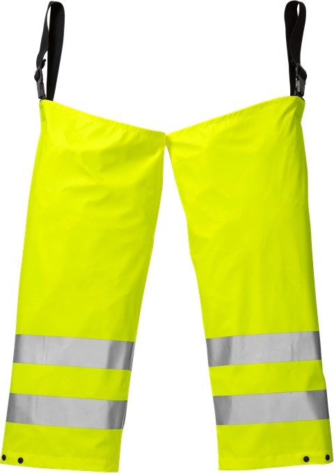 Robust high-visibility rainwear as overtrousers, which are attached to the belt of the actual trousers with adjustable rubber loops.