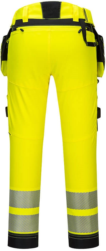 The DX4 removable hi-vis holster trousers are ergonomically designed and use the targeted placement of dynamic 4X stretch fabrics to ensure maximum freedom of movement when working. The pants feature a high back waistband with side elasticity to provide protection in all working positions. Pre-curved, adjustable knee pad pockets, generous front pockets and multi-functional zippered thigh pockets provide secure storage. Triple stitched seams for maximum durability.