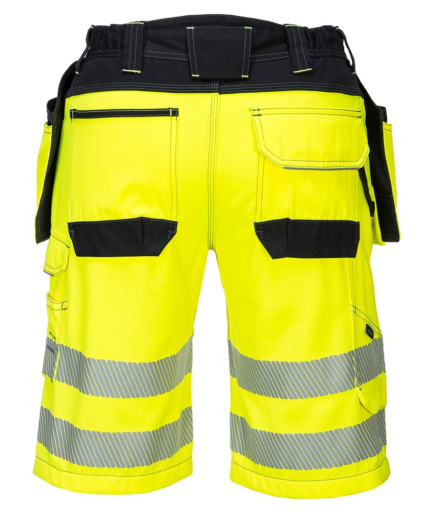 The PW3 Hi-Vis Shorts are stylish and offer a modern fit for excellent working comfort. Numerous pockets, including removable holster pockets, ID and ruler pocket, and an easily accessible thigh pocket provide excellent personal security. Premium features include HiVisTex Pro reflective tape, elastic crotch, hammer loop, and reinforced inserts in high-stress areas for maximum durability.