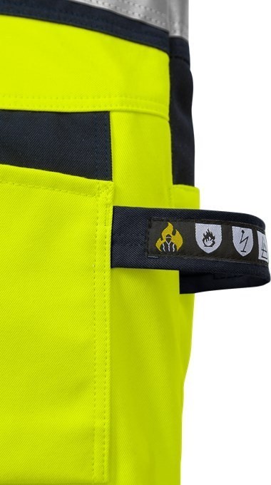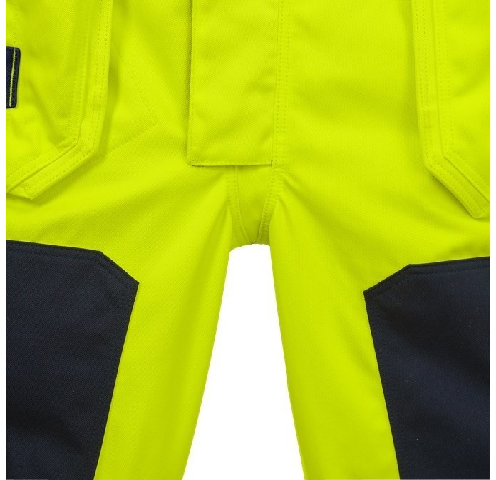 High visibility certified dungarees with inherent flame protection and CORDURA® reinforcements on the knees. Suitable for ATEX environments, without metal parts. Suitable for industrial laundering.