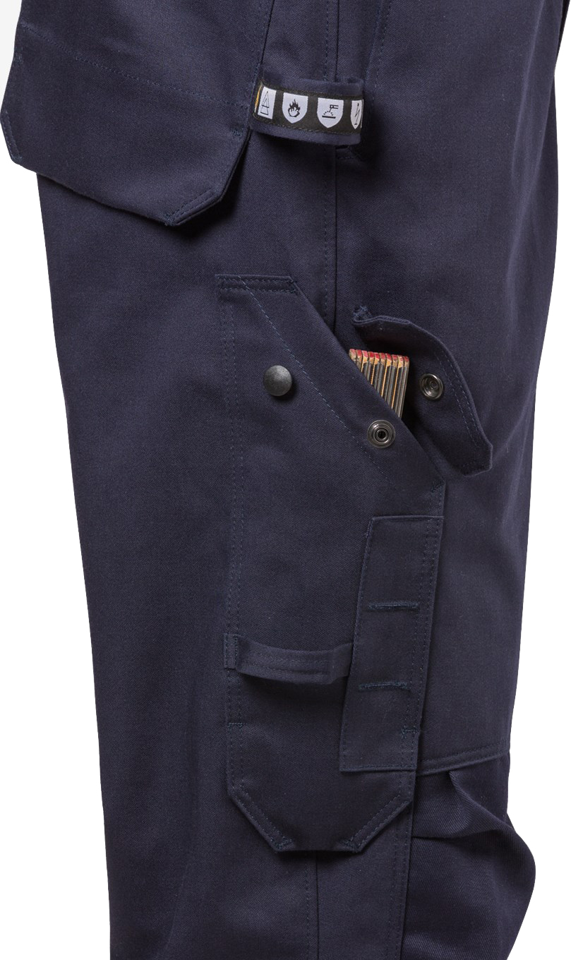 High Vis certified flame protection coverall, approved for welding work. Made of flame-retardant treated material, hard-wearing and comfortable. The design has a dark color in areas that are frequently exposed to dirt. Suitable for 50 industrial washes.
