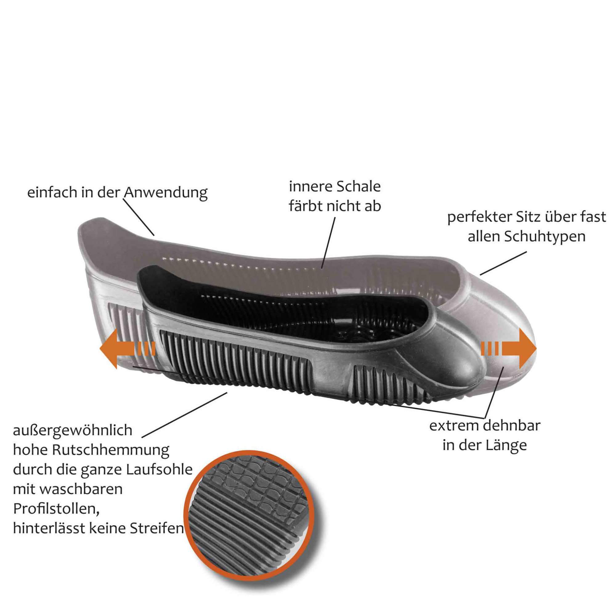 Certified, slip-resistant overshoes - up to 340% above SRC standard, autoclavable anti-slip overshoes made of latex ► Prevention of slipping accidents on wet or slightly oily floors! Slip resistance on greasy and damp floors, certified according to NF EN ISO 20347 SRC, FO (resistance to hydrocarbons)Ideally suited for the prevention of slip accidents in the food and beverage industry, in restaurants, in industrial cleaning and as dirt protection for craftsmen.- Closed, waterproof shell made of natural latex (hardness: Shore A 50) with exceptional elasticity for a perfect fit over almost any type of shoe - hygienic and comfortable.