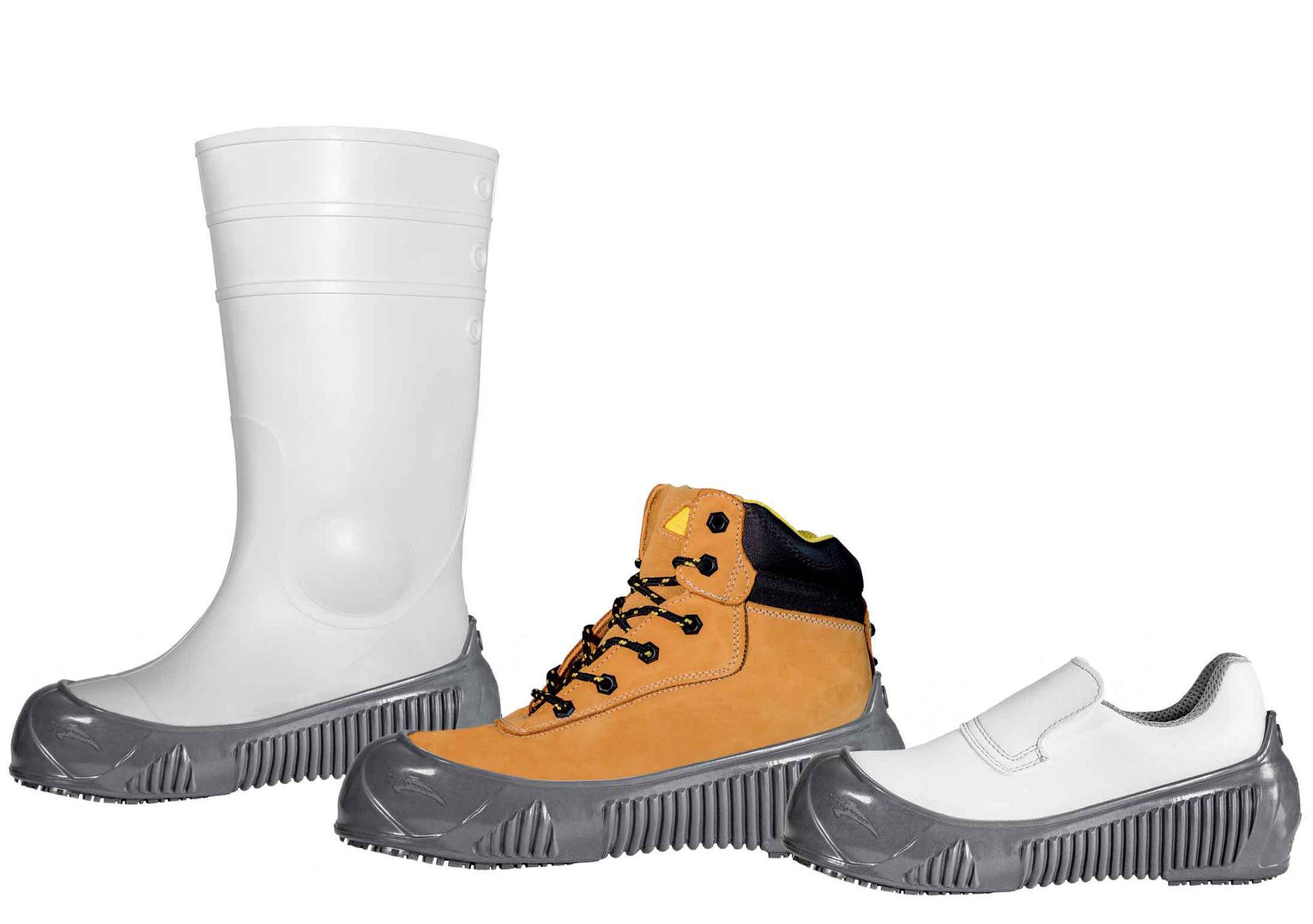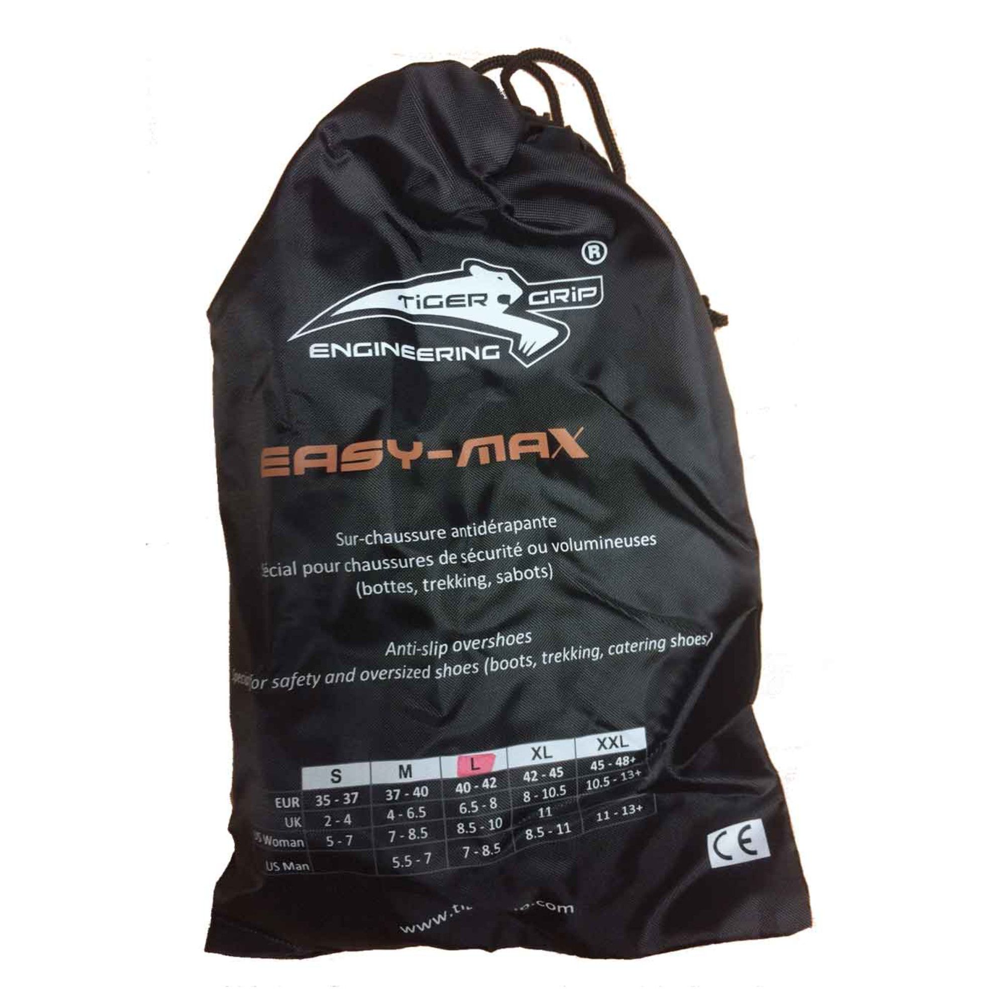 certified anti-slip overshoes - up to 340% above SRC standard Fields of application:over safety shoes, professional shoes,boots,in hotels,restaurants,canteenkitchens, foodindustry,roofers,other areas with slippery floors Slip resistance: SRCSlip coefficient: SRA - ceramic floor with water: = up to 0.62 (standard 0.32) Ceramic floor with detergent = up to 0,54 (standard 0,32) SRB steel floor with oil = 0.62 (standard 0.18) SRC if both test methods have been met Properties: Standard: Anti-slip - SRC NF EN 13287 Certified CE, PPE category II : NF EN ISO 20347:2012 The design provides extreme stretch and perfect fit to the shoe.Slip resistant overshoes with a preformed, elevated and liquid-tight shell made of natural latex. Perfect fit over safety shoes, boots and other footwear with a high toe area. Entire TigerGrip® anti-slip outsole with washable cleats, made of natural latex with special anti-slip tread for maximumslip resistance on wet or slightly oily floors as well as on slipper
