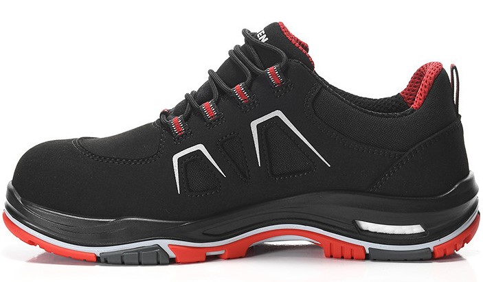The ALAN XXTP black-red Low ESD S3S is a safety shoe exactly according to your wishes. The S3S low shoe from the WELLMAXX product group is an ESD-capable safety shoe that makes it possible to work comfortably at all times. It is covered with an upper made of hydrophobized textile and hydrophobized microfiber. The textile lining is breathable and very skin-friendly. Protection is provided by the plastic toe cap, making the safety shoe a lightweight companion for everyday work. The TPU/PU outsole WELLMAXX TRAINERS POWER is a two-layer profile sole and protects the foot with the additional textile penetration protection and also convinces with a soft core made of Infinergy® material from BASF. You can even see it, through viewing windows on the side of the midsole and on the underside of the outsole. But you don't just see it, you feel it above all, because the core provides unique cushioning and special comfort when you run. This makes every step many times more dynamic and the material