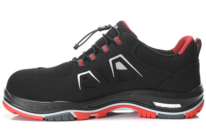 Anyone looking for a safety sandal that is just as tough as a conventional safety shoe, but more relaxed in its handling and absolutely comfortable, will appreciate this all-rounder: The ALAN XXTP black-red Easy ESD S1PS is the best choice, especially where higher temperatures are the order of the day and breathable footwear is highly recommended. Who wants to work in clunky, sweaty shoes in hot weather? And all day long? That's why the upper material here is made of microfiber and textile, which together with the breathable textile lining ensures good air circulation. Thanks to the lacing system with individual quick-release fastening, the sandal fits quickly and snugly on the foot. The plastic toe cap provides extra protection against falling objects and the textile penetration protection repels sharp objects on the ground. The special feature here is the two-layer sole WELLMAXX TRAINERS POWER made of TPU/PU. It is dynamic, very flexible and provides excellent slip resistance. The so