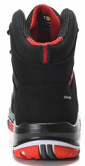 The WELLMAXX product group is growing! The ALAN XXTP black-red Mid ESD S3S conquers the working world with its sporty design and power sole. Kneeling activities and working on uneven surfaces are no problem with this boot. The mid-height safety boot features an upper mix of hydrophobized microfiber and hydrophobized textile. The textile lining is skin-friendly and extremely breathable. Due to the high absorption or release of sweat, climate regulation in the boot is guaranteed. What is also guaranteed is safety! Due to the toe protection cap made of plastic, the toe area is optimally protected and impact effects are averted. We come to the highlight of the boot, the TPU/PU outsole WELLMAXX TRAINERS POWER. Its tri-color tread ribs are arranged to provide particularly strong slip resistance. The windows on the side and under the sole show that Infinergy® material from BASF has been used here. This cushioning miracle makes standing and walking for long periods a pleasure and even gives b