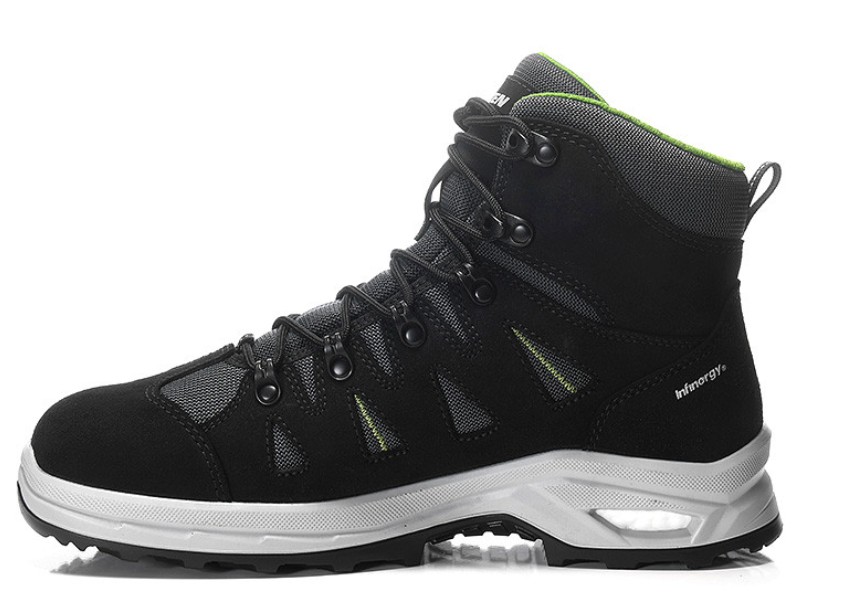 The RIWEMO XXP GTX black-green Mid ESD S2 WR CI is the perfect companion for all those who want to go about their working day safely, comfortably and with a touch of style - even when the weather gods are not so gracious. The upper material is made of water-repellent suede and water-repellent textile material, so that it can cope with rain, moisture and wetness of any kind with ease. But the real hero comes from the inside: The GORE-TEX Performance Comfort Footwear lining keeps your feet dry, even if you stand in a puddle - the shoes stay waterproof and your feet can still breathe. The steel toe cap protects the toes from the various dangers of everyday working life - be it the heavy bucket of building materials or machines and tools. In addition, the PU/PU sole WELLMAXX PEAK provides excellent cushioning, because thanks to Infinergy® from BASF it is very, very comfortable even on hard industrial floors, even if you are on your feet for several hours.