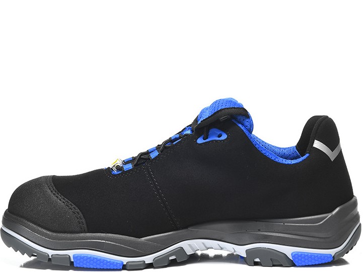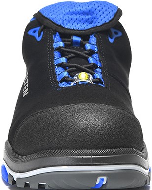 The sporty black-blue safety shoe is made of hydrophobic microfibre and is particularly breathable on the inside thanks to a lining made of textile material. The wearing comfort is further increased by a semi-orthopaedic, ESD-capable insole as well as a TPU/PU sole, which stands out due to its particularly good shock absorption. Incorporated pivot points minimize frictional resistance during rotation. The abrasion-resistant toe protection and an integrated st