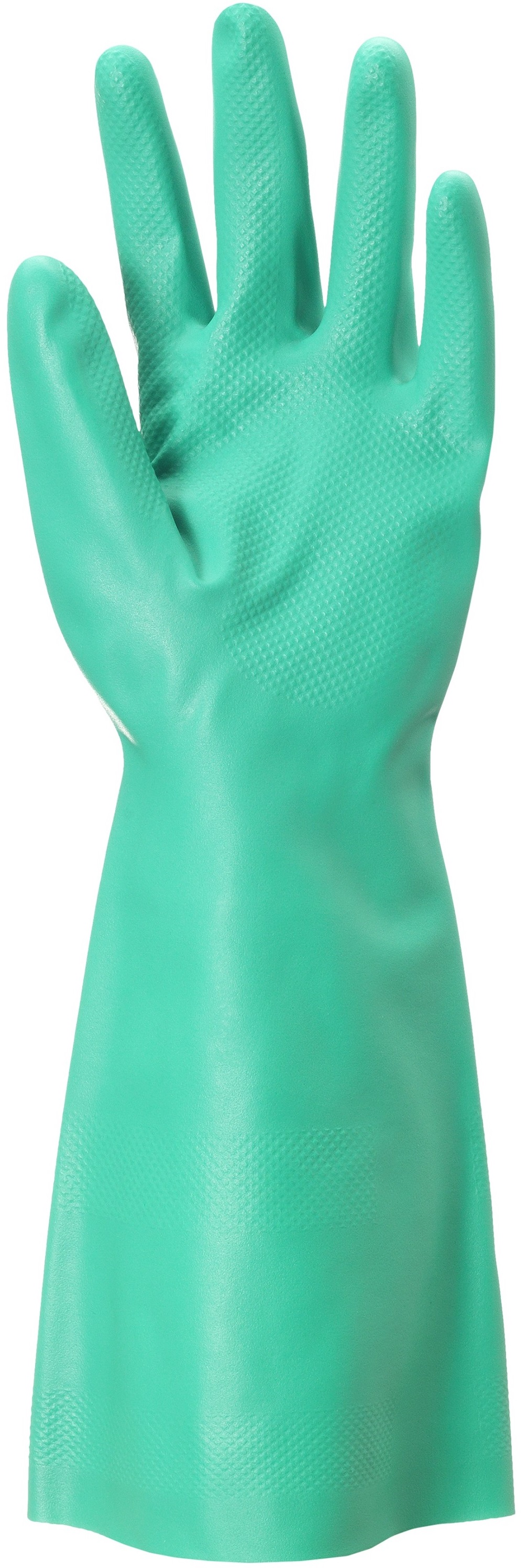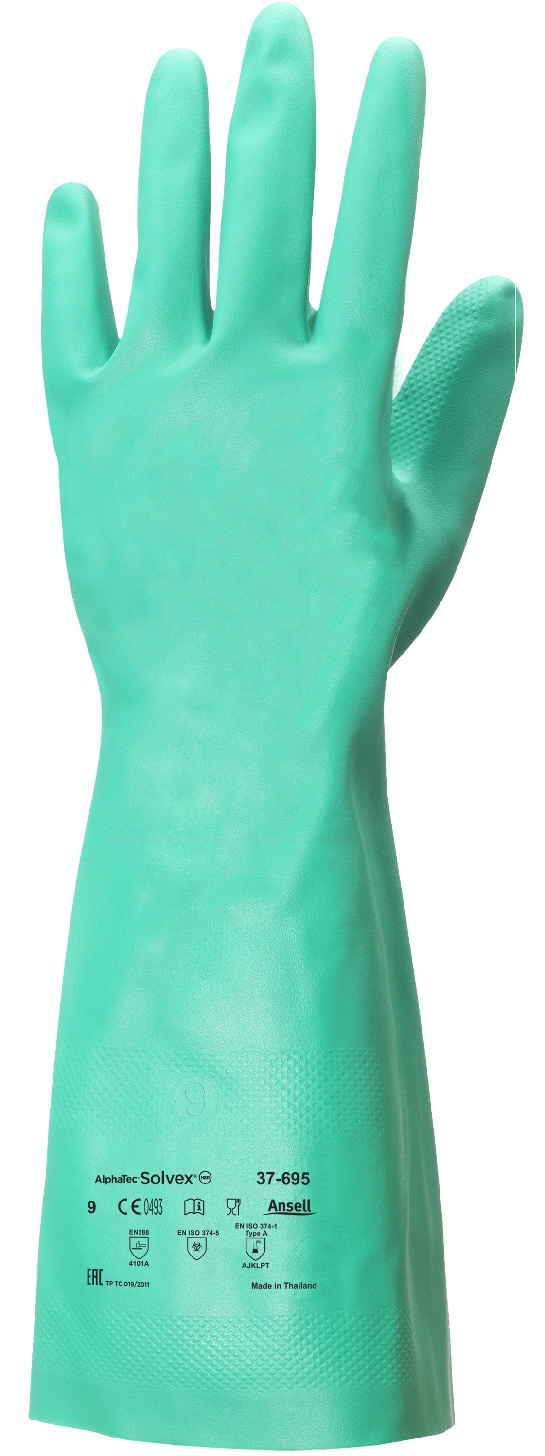 Ansell's Sol-Vex® nitrile glove range is available in a wide selection of lengths, wall thicknesses, sizes and linings. Sol-Vex® achieves optimum results in dry and wet work environments where superior chemical protection is critical. This reusable glove offers remarkable comfort with its uniquely high abrasion resistance. Sol-Vex® nitrile gloves are the ideal choice for safe handling of aggressive chemicals. The cotton velour lining, combined with the flexibility and dexterity of Ansell nitrile rubber, provides the user with exceptional comfort. Its diamond finish enhances grip. The Sol-Vex®'s hammer-blow profile, with its non-slip surface, reduces the scrap of sensitive parts due to damage and thus indirect costs. The Sol-Vex® model (37-695) is longer (38 cm) than the standard version and additionally protects the wrist and forearm.