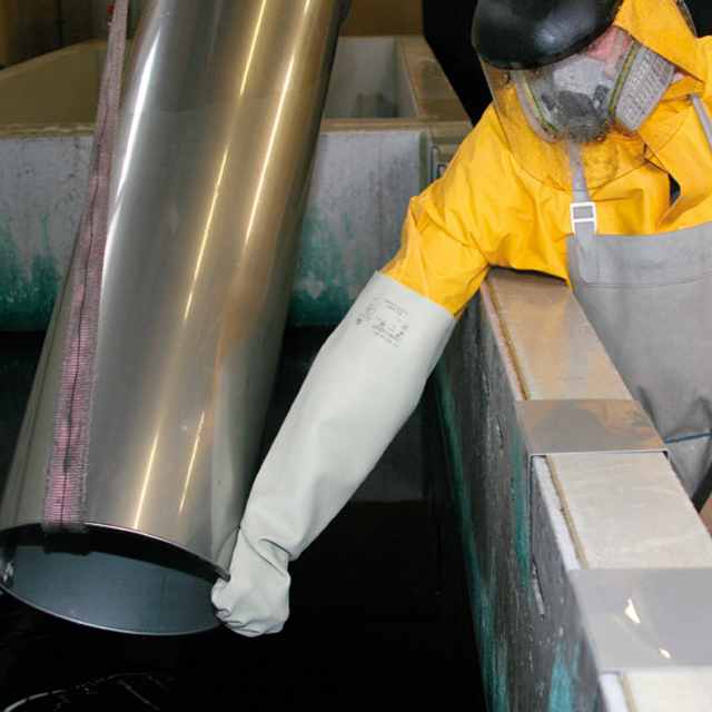 Heavy natural latex gloves for rough work with simultaneous contact with chemicals. The coarse roughened surface allows a good grip even on damp objects. The different lengths allow the use for every workplace requirement.