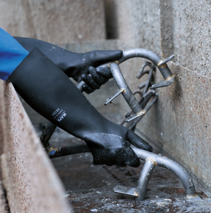 Very good resistance to a variety of chemicals. Good grip due to non-slip profile. Long cuff to protect forearm. Easy to put on and take off due to chlorinated inside. Highe Abriebfestigkeit. Optimum security through colour coding: mechanical damage is immediately visible through the red inner layer. Application: Chemical treatment of metals (acids), electroplating, petroleum industry, application of fertilizers, handling of chemical products, cleaning, production of paints and varnishes.